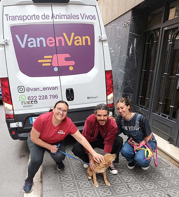 Tres personas y un perro posando al lado furgoneta especializada en el transporte de animales.