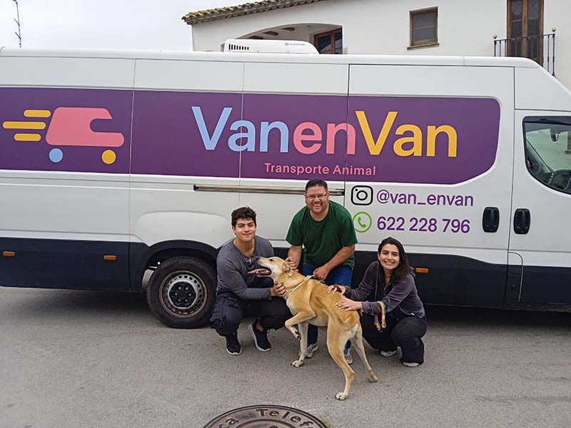 Tres adultos con un perro delante de una furgoneta rotulada con el nombre de VanenVan.